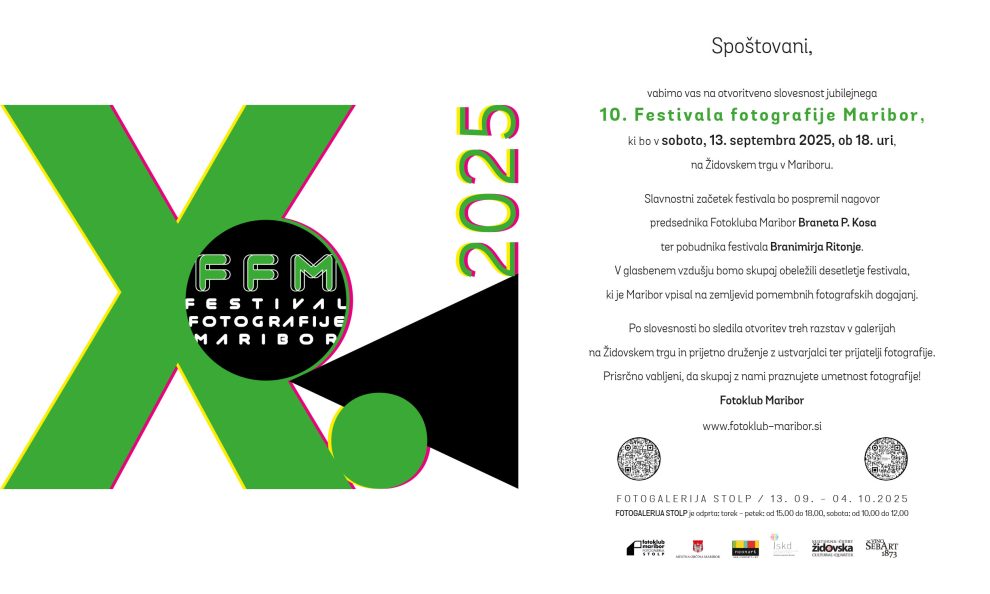 10. Festival fotografije Maribor 20. September 2025 Ostale objave Dogodki107 GalerijaFzs4 Natečaji248 Neuvrščeni1 Objava3 Obvestila207 Obvestila – poteklo1 Obvestila FZS156 Predavanja11 Razstava777 Zapisniki39 Aktualno Razstava Anja Kosmač: Večni derbi Razstava Miroslav Ilić: SAMUI Razstava Lidija Polajžer: NAJINA EDNINA Razstava Sergej Maršnjak: Beneške maske Razstava Janez Kramar: Bela puščava