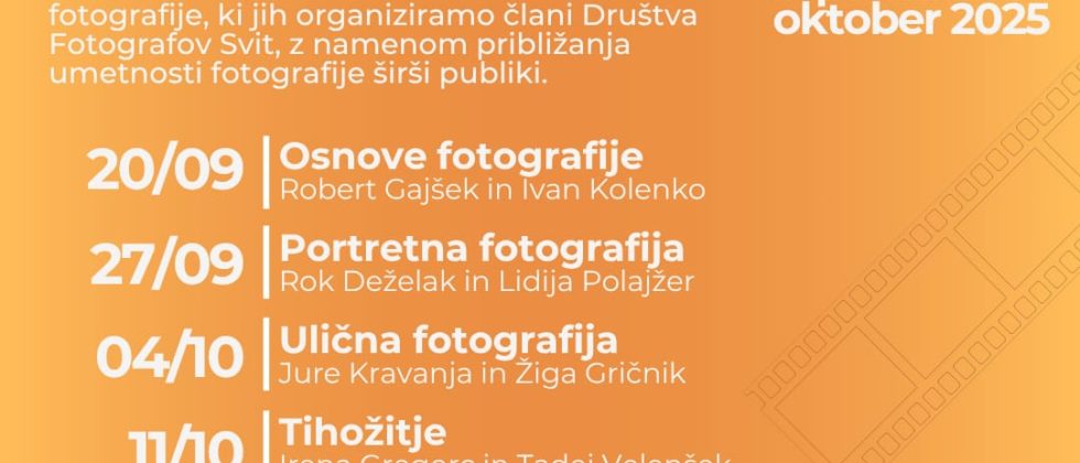 Tudi letos v Društvu fotografov Svit pripravljajo brezplačne fotografske delavnice v septembru in oktobru! Delavnice organizirajo vsako leto in so namenjene vsem – tako začetnikom kot izkušenim fotografom. Skupaj boste spoznali praktične trike, preizkusili nove pristope in izmenjali izkušnje v sproščenem okolju. Vabljeni!