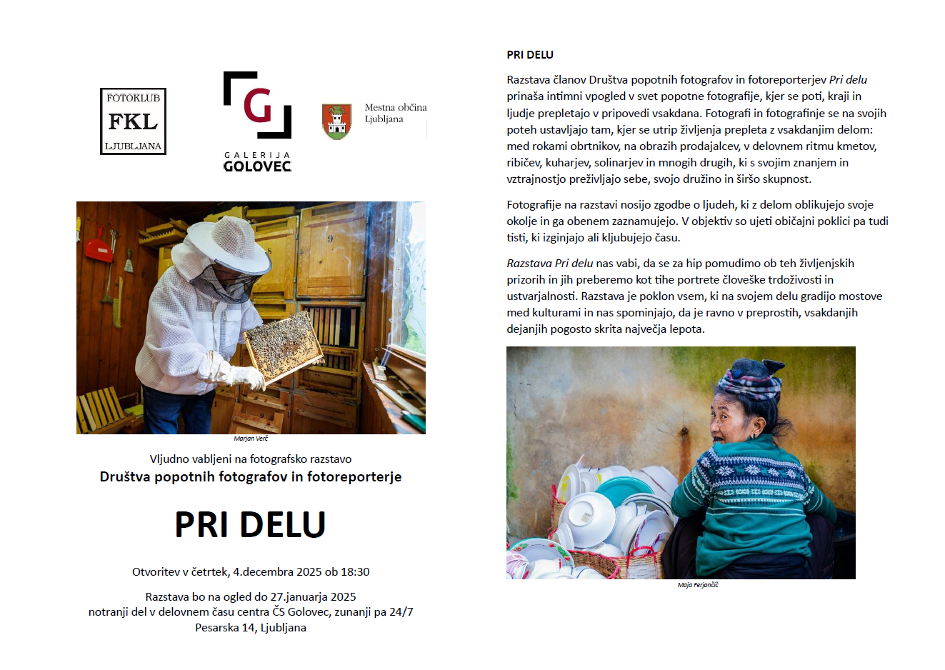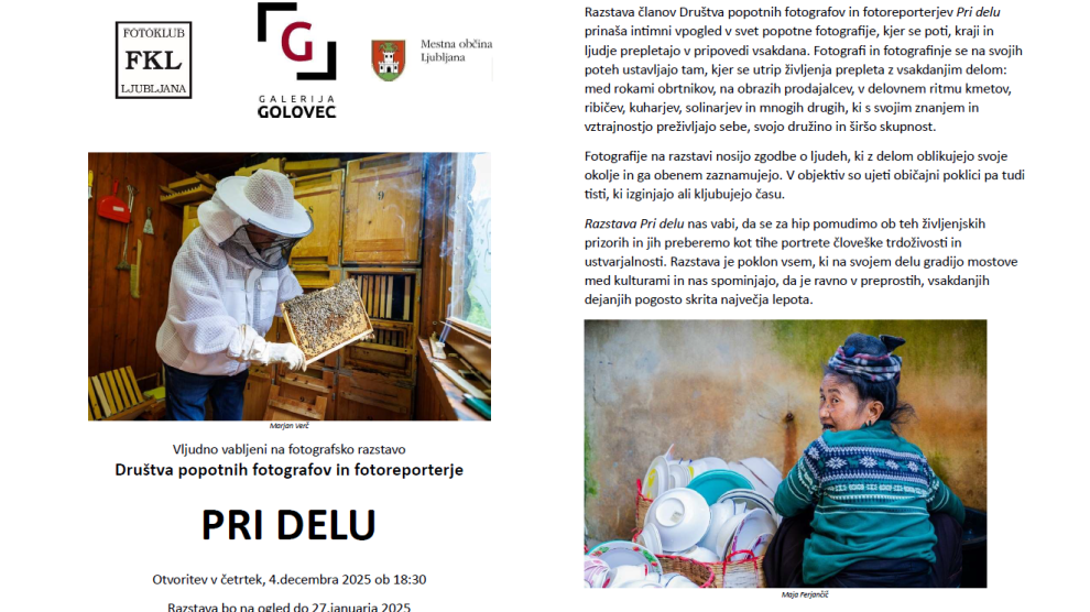Razstava Pri delu nas vabi, da se za hip pomudimo ob teh življenjskih prizorih in jih preberemo kot tihe portrete človeške trdoživosti in ustvarjalnosti. Razstava je poklon vsem, ki na svojem delu gradijo mostove med kulturami in nas spominjajo, da je ravno v preprostih, vsakdanjih dejanjih pogosto skrita največja lepota.
