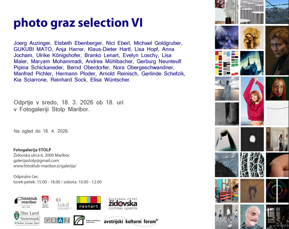 Fotogalerija STOLP: photo graz selection VI 17. March 2026 Ostale objave Dogodki108 GalerijaFzs4 Natečaji260 Neuvrščeni1 Objava3 Obvestila207 Obvestila – poteklo1 Obvestila FZS161 Predavanja11 Razstava835 Zapisniki39 Aktualno Razstava Fotogalerija STOLP: photo graz selection VI Razstava Večer z avtorjem – MATJAŽ PREŠEREN Razstava odprtje razstave PANNONIA REFLECTIONS Razstava Maja Šivec: Nasilje nad ženskami Razstava Razstava fotografij članic FK Žarek