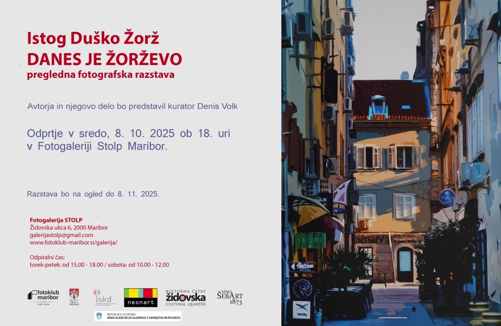 Istog Duško Žorž: Danes je Žorževo 5. October 2025 Ostale objave Dogodki107 GalerijaFzs4 Natečaji248 Neuvrščeni1 Objava3 Obvestila207 Obvestila – poteklo1 Obvestila FZS156 Predavanja11 Razstava777 Zapisniki39 Aktualno Razstava Anja Kosmač: Večni derbi Razstava Miroslav Ilić: SAMUI Razstava Lidija Polajžer: NAJINA EDNINA Razstava Sergej Maršnjak: Beneške maske Razstava Janez Kramar: Bela puščava