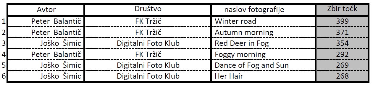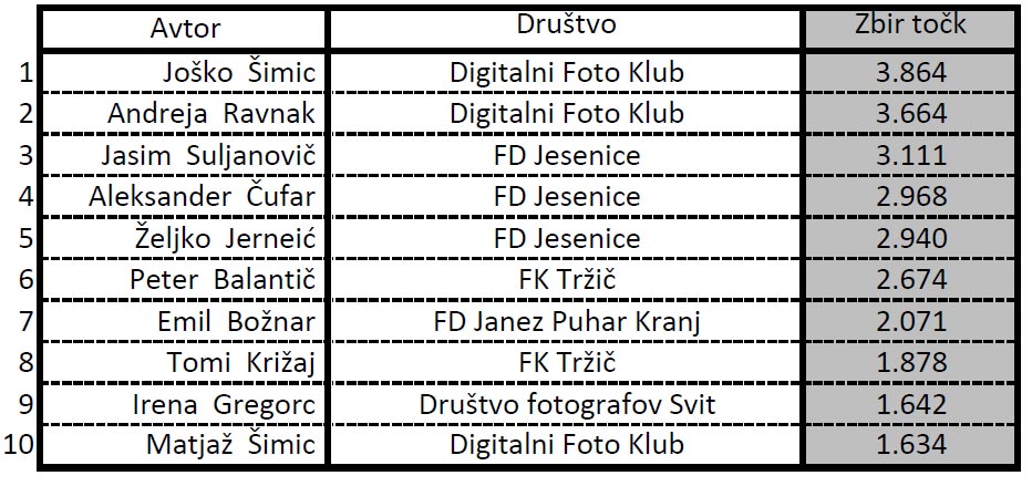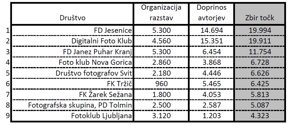 Najuspešnejša društva, razstavljalci in posnetki leta: Poročilo za 2024 1. October 2025 Vasja Doberlet, član IO FZS, je pregledal in obdelal vloge za najuspešnejša društva, razstavljalce in posnetke leta 2024 in sporoča rezultate: NAJUSPEŠNEJŠA DRUŠTVA NAJUSPEŠNEJŠI AVTORJI NAJUSPEŠNEJŠI POSNETKI Ostale objave Dogodki107 GalerijaFzs4 Natečaji248 Neuvrščeni1 Objava3 Obvestila207 Obvestila – poteklo1 Obvestila FZS156 Predavanja11 Razstava777 Zapisniki39 Aktualno Obvestila FZS Najuspešnejša društva, razstavljalci in posnetki leta: Poročilo za 2024 Obvestila FZS Razpis za pridobivanje razstavljavskih nazivov FZS za leto 2025 Obvestila FZS novo pri FIAP: Slovenska predstavnica sekcije doktorjev Obvestila FZS opomnik: oddaja obrazcev za najuspešnejše avtorje / fotografije / klube FZS za leto 2024 Obvestila FZS podelitev FZS in FIAP nazivov