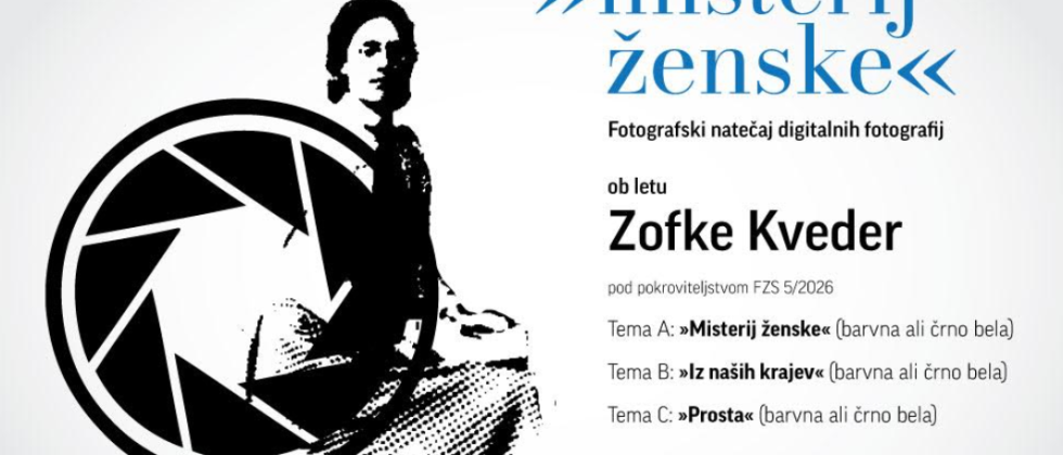 »MISTERIJ ŽENSKE« FOTOGRAFSKI NATEČAJ DIGITALNIH FOTOGRAFIJ pod pokroviteljstvom FZS 5/2026 NATEČAJ POTEKA OB LETU ZOFKE KVEDER POSVEČEN JE OBELEŽITVI 100. OBLETNICE PISATELJIČINE SMRTI TEME NATEČAJA: Tema A: »Misterij ženske« (barvna ali črno bela) Avtorice in avtorji naj prikažejo svež in prodoren pogled na ženske ob upodabljanju njihove drznosti, radoživosti ter iskrivosti v dejanjih in … Continue reading razpis: MISTERIJ ŽENSKE