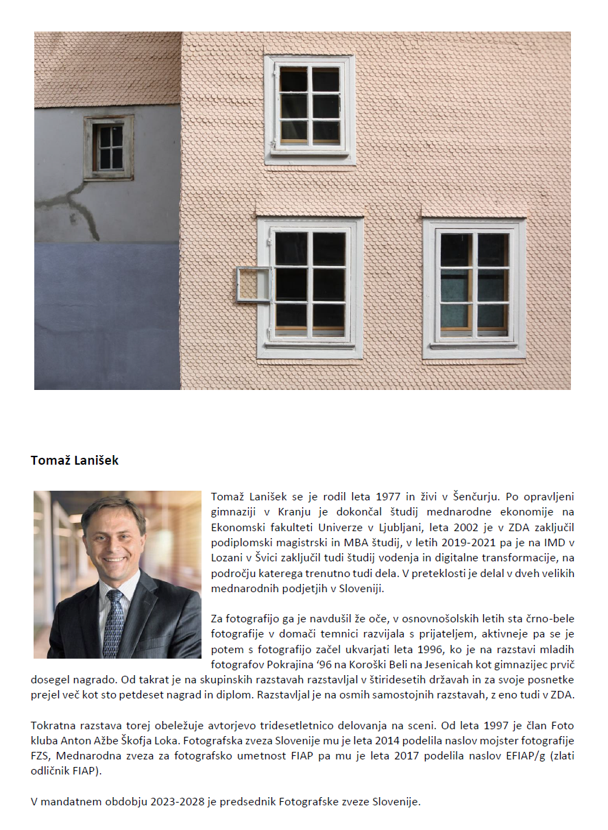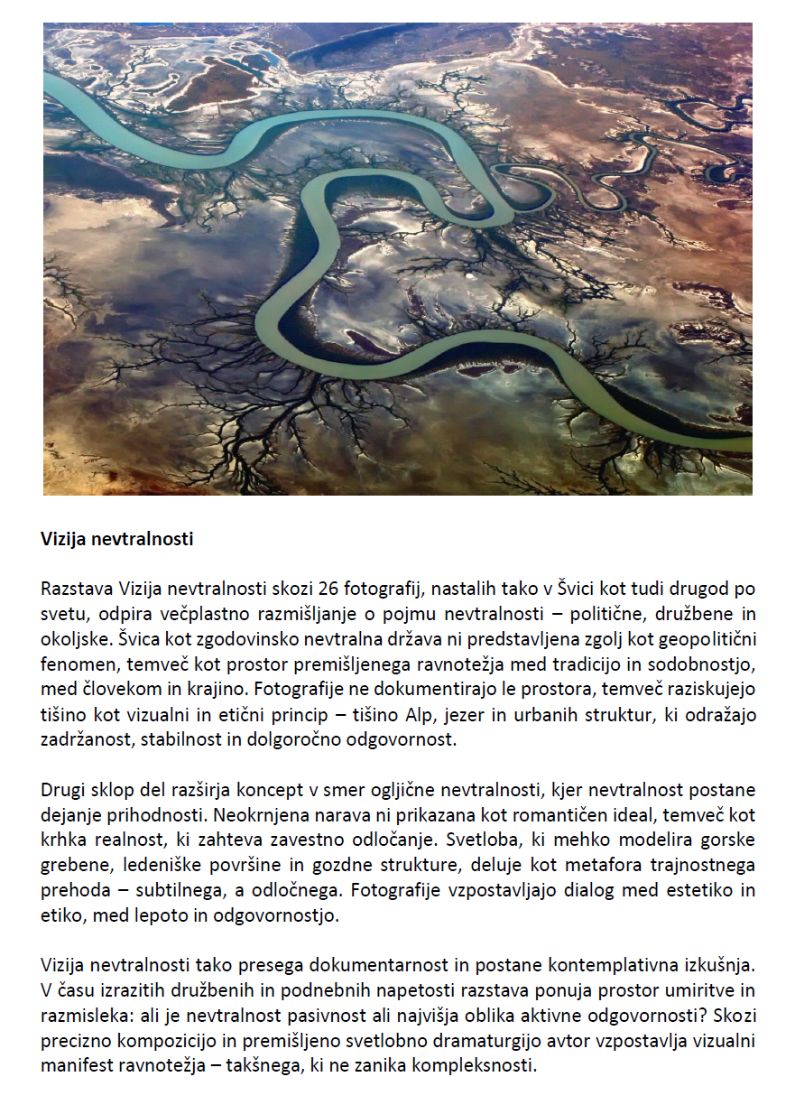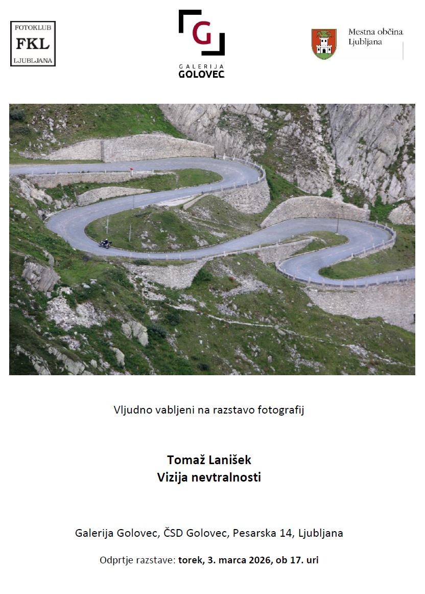 Tomaž Lanišek: Vizija nevtralnosti 2. March 2026 Ostale objave Dogodki108 GalerijaFzs4 Natečaji258 Neuvrščeni1 Objava3 Obvestila207 Obvestila – poteklo1 Obvestila FZS161 Predavanja11 Razstava829 Zapisniki39 Aktualno Razstava članice FDJP Kranj: Pogled skozi žensko oko Razstava 1. klubska fotografska razstava Fotokluba Murska Sobota: SIVINE Razstava Aleš Lemut: ŠTALA – oder brez filtrov Razstava Tomaž Lanišek: Vizija nevtralnosti Razstava Od Prešerna do mimoze, ženski pogledi